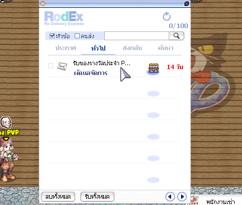 ไอเท็มนั้นเข้าที่ตู้จดหมาย ผู้เล่นสามารถกดดูตู้จดหมายได้ด้วยการกด Ctrl+M จะขึ้นหน้าต่างตู้จัดหมายดังภาพ