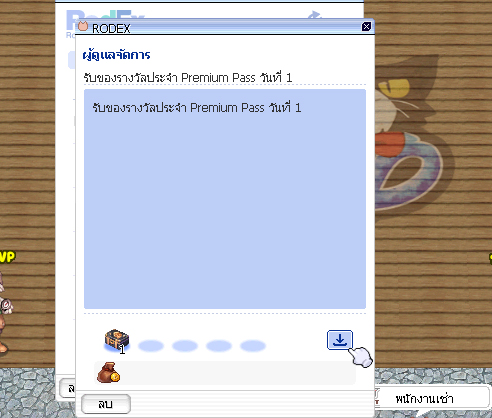 ผู้เล่นเปิดจดหมายนั้นก็จะปรากฎดังภาพ ให้ผู้เล่นกดปุ่มรับของที่เป็นลูกศรลง ก็จะรับของรางวัลเรียบร้อย